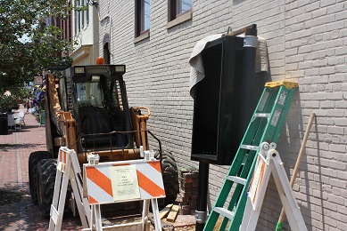The mystery was solved last Thursday, when the frame for Downtown Chestertown Association’s interactive digital sign, (iSign), was delivered from Grieb Manufacturing. The Chestertown Public Works team, headed by Tom Sappington, was responsible for installing the frame .