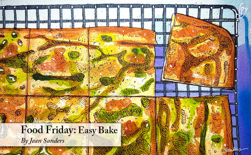 It’s time to do some easy baking; baking that delivers deliciousness for our minimal investment of time (and skill). It’s time for focaccia. Which is sublime when hot from the oven. It is good warm, it freezes well, and can be eaten for any meal. It is deeply satisfying to bake something warm and oozing olive oil and garlic – without all the bother of sour dough starter maintenance that found its way onto every homebound COVID-19 survivor’s to-do list.